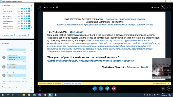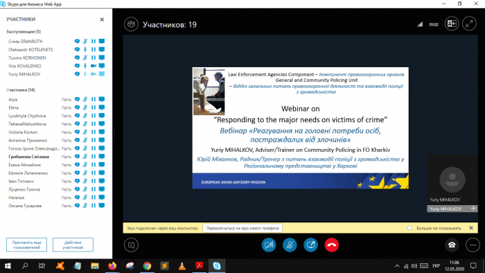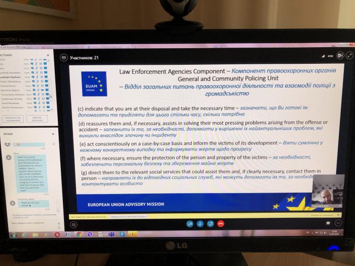 Основний спікер заходу радник з питань взаємодії поліції з громадою Регіонального представництва Консультативної місії Європейського Союзу у м. Харків Юрій Міхалков (Болгарія), який розкрив такі питання, як Кодекс етики працівників правоохоронних органів, основні типи жертв та їх основні права, алгоритм надання допомоги таким особам, а також поділився власним практичним досвідом щодо потреб осіб, постраждалих від злочинів.