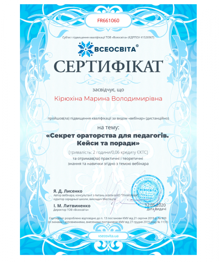Викладач циклової комісії соціально-гуманітарних дисциплін Кременчуцького льотного коледжу Харківського національного університету внутрішніх справ Марина Кірюхіна взяла участь у вебінарі на тему «Секрет ораторства для педагогів. Кейси та поради». Вона отримала теоретичні й практичні знання та навички щодо теми вебінару, які будуть використані в освітньому процесі.