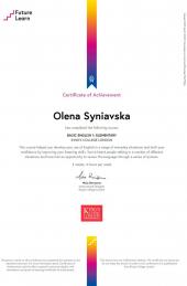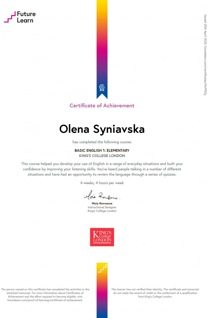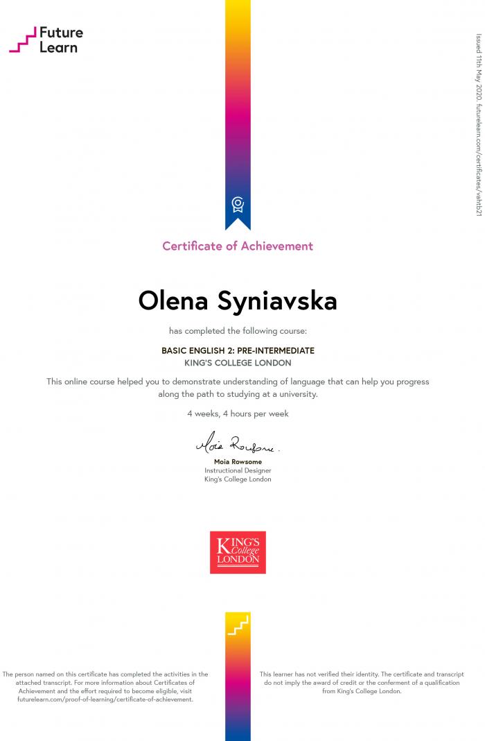 Професор кафедри правоохоронної діяльності та поліціїстики факультету № 6 доктор юридичних наук, професор Олена Синявська успішно пройшла два дистанційних курси з англійської мови: «Basic English 1 elementary» та «Basic English 2: pre-intermediate» на платформі FutureLearn у King's College London й отримала відповідні сертифікати.