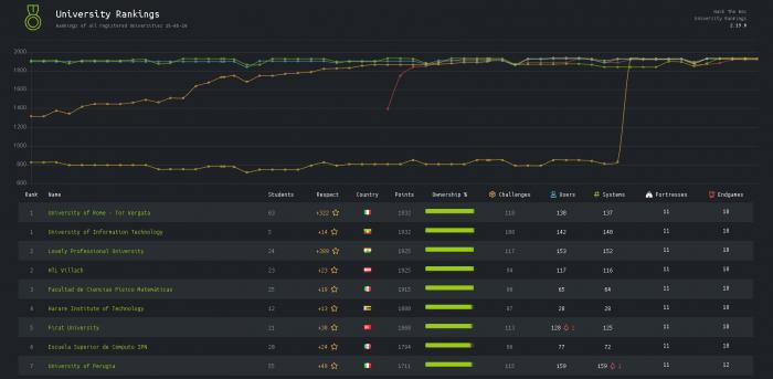 Важливим елементом практичного навчання є також набуття курсантами знань в умовах, наближених до реальних. З цією метою команда університету бере участь у проходженні квестових завдань з пентестінгу у віртуальній лабораторії «Hack The Box» (https://www.hackthebox.eu/) і посідає 25 сходинку серед 340 університетів, зареєстрованих на платформі.