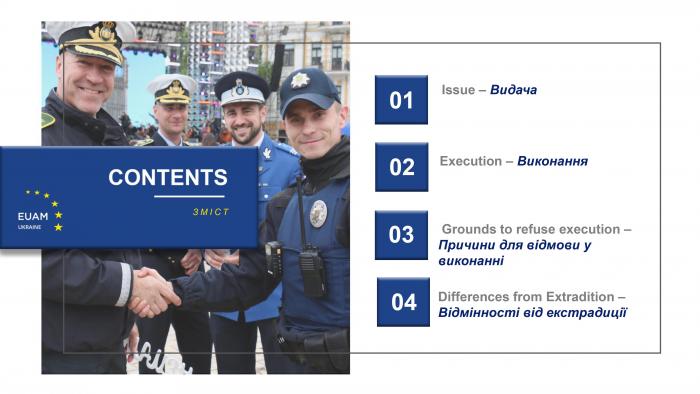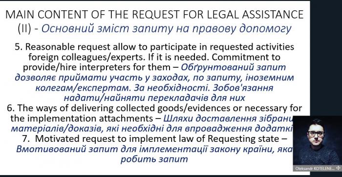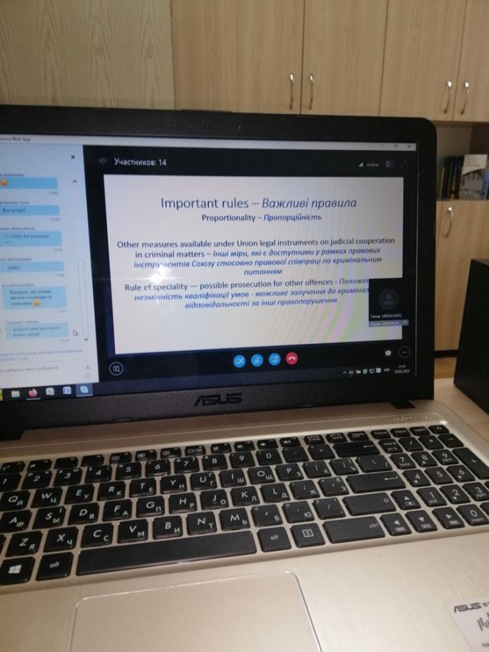 Під час вебінару були розглянуті питання: особливості надання міжнародної правової допомоги, процедура подання запиту, ознайомлення осіб з процедурою запиту та видачею судового ордеру, поняття, принципи та процес виконання Європейського ордеру на арешт, причини для невиконання, відмінності від екстрадиції тощо.