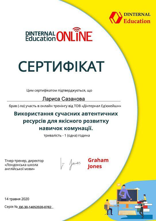 Старший викладач кафедри іноземних мов факультету № 1 Лариса Сазанова ознайомилася з сучасними підходами до викладання іноземних мов та взяла участь в онлайн-тренінгу «Використання автентичних ресурсів для якісного розвитку навичок комунікації», який провів тічер-тренер, директор «Лондонської школи англійської мови» Грехем Джоунз. Він зазначив, що запорукою формування комунікативної компетенції майбутнього фахівця є використання автентичних матеріалів, що є однією зі складових успішного практичного заняття з іноземної мови професійного спрямування.