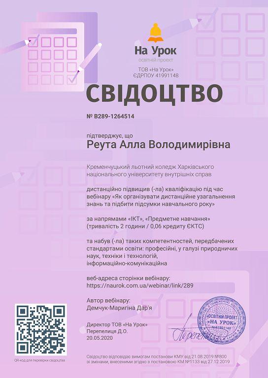Викладач циклової комісії авіаційного транспорту Кременчуцького льотного коледжу ХНУВС Алла Реута дистанційно підвищила кваліфікацію під час вебінару на тему «Як організувати дистанційне узагальнення знань та підбити підсумки навчального року» за напрямами «ІКТ», «Предметне навчання» освітнього проєкту «На Урок». Викладачка набула компетентностей, передбачених стандартами освіти: професійні, у галузі природничих наук, техніки і технологій, інформаційно-комунікаційні.