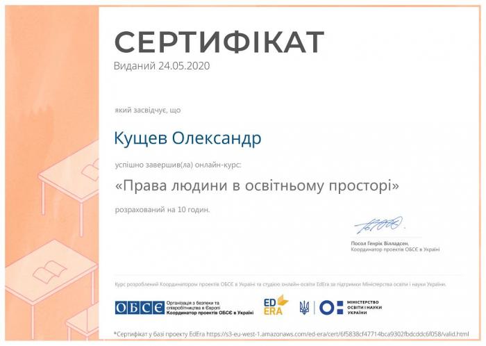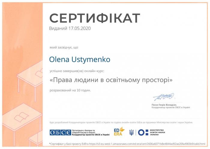 Начальник відділу міжнародного співробітництва Олена Устименко, фахівці відділу Олена Михайлик та Олександр Кущев пройшли освітній онлайн курс «Права людини в освітньому просторі». Протягом цього курсу були розглянуті питання: історія розвитку концепції прав людини, філософія прав людини, каталог прав людини, громадянські та політичні права; соціально-економічні та культурні права; інститути та механізми захисту прав людини, обмеження прав людини, права людини та учасники освітнього процесу; права людини в інформаційному просторі, забезпечення та захист прав людини в освітньому просторі.