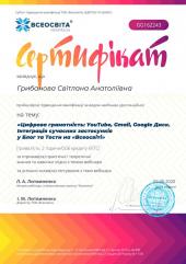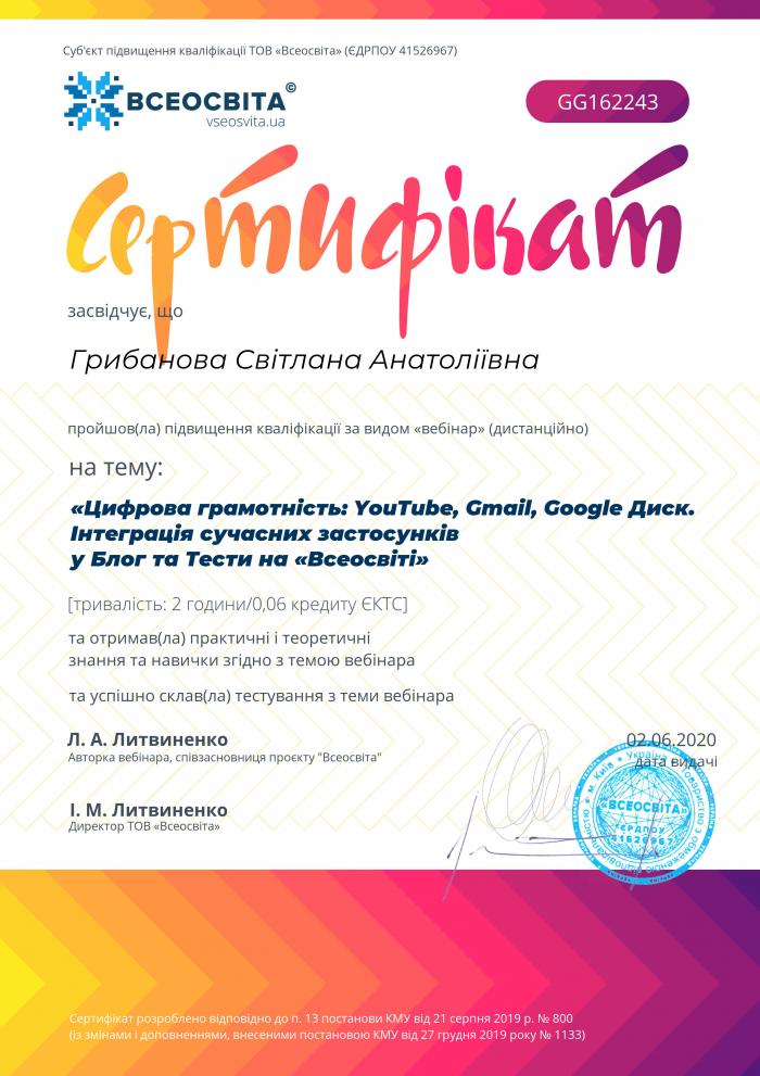 Голова та викладач циклової комісії фізико-математичних дисциплін та інформатики Кременчуцького льотного коледжу Харківського національного університету внутрішніх справ Людмила Пилипенко, Світлана Грибанова взяли участь у вебінарі на тему «Цифрова грамотність: YouTube, Gmail, Google Диск. Інтеграція сучасних застосунків у Блог та Тести на «Всеосвіті».