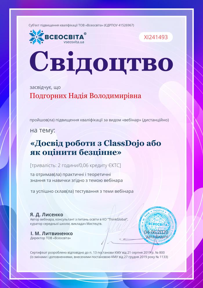 Під час вебінару були розкриті питання щодо можливостей гейміфікації освітнього процесу через за стосунок ClassDojo. Отримані знання викладачка зможе застосовувати під час навчальних занять та у виховній роботі.