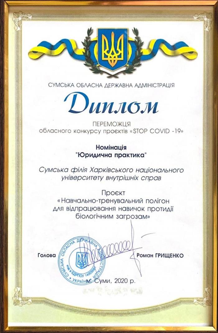 Отримали також нагороди п’ять переможців обласного конкурсу проєктів «STOP COVID-19», що проводився протягом травня 2020 року за ініціативи Сумської обласної державної адміністрації. У номінації «Юридична практика» отримав перемогу проєкт Сумської філії Харківського національного університету внутрішніх справ «Навчально-тренувальний полігон для відпрацювання навичок протидії біологічним загрозам».