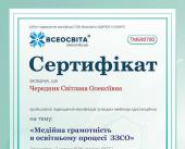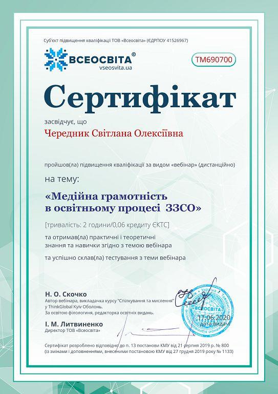 Викладачка циклової комісії української та іноземної мов Кременчуцького льотного коледжу Харківського національного університету внутрішніх справ Світлана Чередник взяла дистанційно участь у вебінарі на тему «Медійна грамотність в освітньому процесі ЗЗСО».