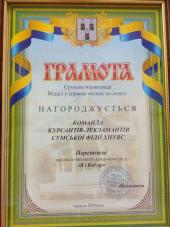 Команда курсантів Сумської філії здобула перемогу у конкурсі і була нагороджена грамотою відділу у справах молоді та спорту Сумської міської ради.