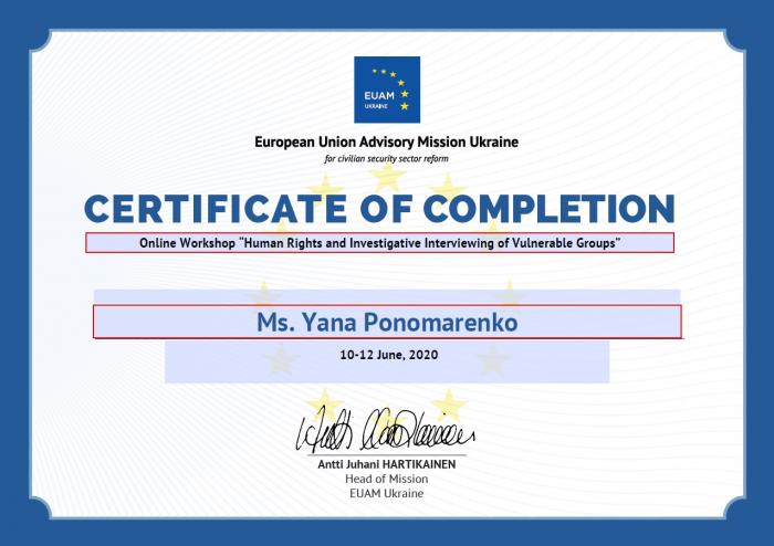 Доцент кафедри соціології та психології Харківського національного університету внутрішніх справ Яна Пономаренко взяла участь у триденному онлайн-семінарі «Права людини та опитування вразливих груп під час розслідувань». Семінар проходив англійською мовою з послідовним перекладом на українську.