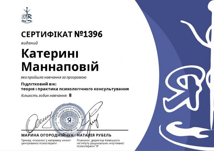 Доцент кафедри соціології та психології Катерина Маннапова пройшла навчання за програмою «Підлітковий вік: теорія та практика психологічного консультування» Київського інституту раціонально-інтуїтивної психотерапії «Я».