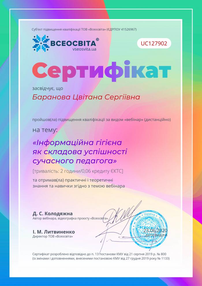 Представники Сумської філії продовжують підвищувати свій професійний рівень в дистанційному режимі. Провідний фахівець Сумської філії Цвітана Баранова пройшла курс з підвищення кваліфікації через ресурс «Всеосвіта» на тему «Інформаційна гігієна як складова успішності сучасного педагога». Спікером онлайн-вебінару стала Діана Колодяжна. Мета заходу – ознайомити аудиторію з алгоритмами критичного споживання інформації, інструментами роботи з інформацією та прикладами їх використання. Основні питання, які було розглянуто під час вебінару: складові інформаційної гігієни в сучасному світі; основні шляхи ефективного споживання, фільтрування та перевірки інформації в медіа та соціальних мережах; алгоритми роботи з інформацією, приклади.