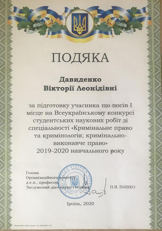 Доцент кафедри кримінального права та кримінології факультету № 6 Вікторія Давиденко, яка підготувала слухачку магістратури до конкурсу, отримала Подяку від організаторів заходу.
