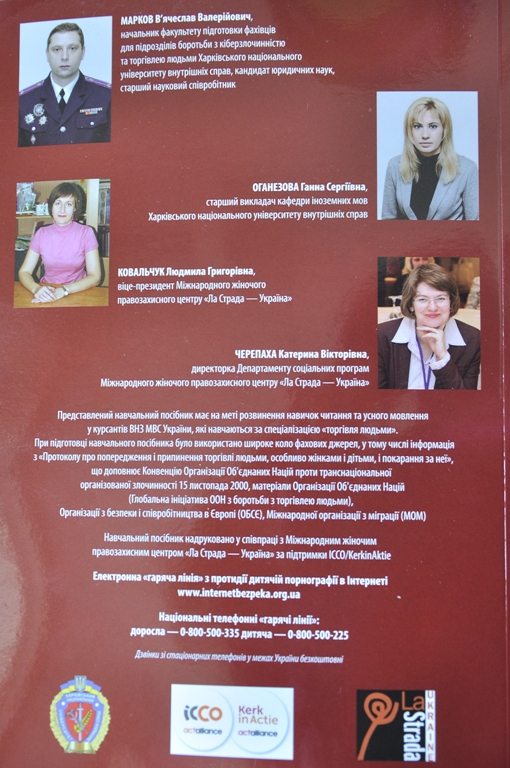Вийшов друком навчальний посібник з англійської мови «Human trafficking counteraction» для курсантів ІІ курсу вищих навчальних закладів системи МВС України, які навчаються за спеціальністю «Торгівля людьми». Навчальний посібник має на меті розвинення навичок читання та усного мовлення у курсантів. Його видано за редакцією начальника факультету підготовки фахівців для підрозділів боротьби з кіберзлочинністю та торгівлею людьми Харківського національного університету внутрішніх справ В’ячеслава Маркова, старшого викладача кафедри іноземних мов університету Ганни Оганезової у співпраці з Міжнародним жіночим правозахисним центром «Ла Страда – Україна» за підтримки ICCO/KerkinAktie.