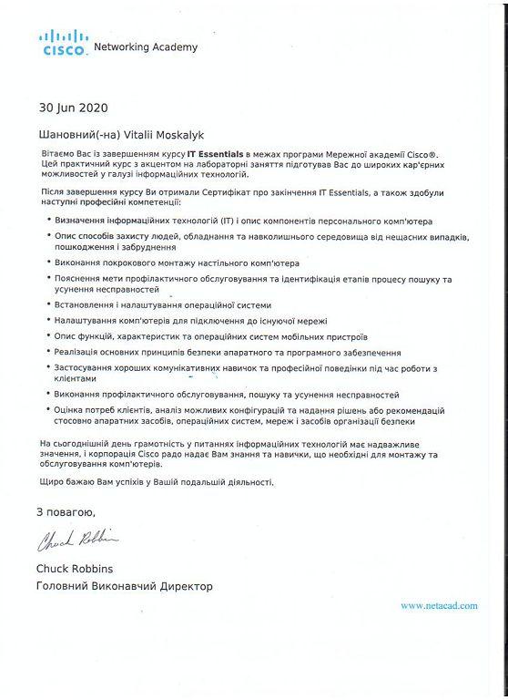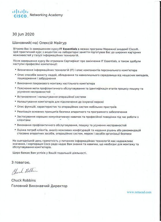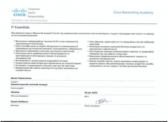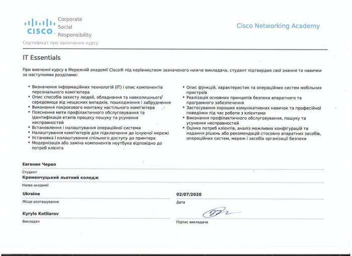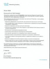 Викладачі та курсанти Кременчуцького льотного коледжу Харківського національного університету внутрішніх справ отримали листи з привітаннями від головного виконавчого директора корпорації CISCO Чака Роббінса з нагоди успішно освоєного онлайн-курсу IT Essentials. Вітальні листи, а також сертифікати отримали: викладач коледжу Віталій Москалик, курсанти Олексій Майгур, Денис Борисенков та Євгенія Череп.
