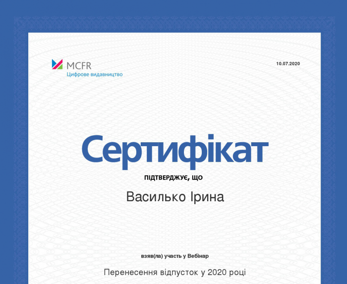 Доцентка кафедри правового забезпечення господарської діяльності факультету № 6 Ірина Василько взяла участь у вебінарі «Перенесення відпусток у 2020 році», організованому Цифровим видавництвом MCFR.