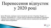 Карантин зруйнував чимало планів на літній відпочинок, тож питання перенесення дат запланованих відпусток є актуальною для багатьох організацій та установ. Під час проведення вебінару його учасникам було надано рекомендації щодо правильного планування та перенесення відпусток. Зокрема, розглядалися питання щодо впливу карантину на тривалість щорічних відпусток 2020 року; як перенести відпустку з ініціативи роботодавця; як оформити перенесення відпустки з ініціативи працівника; чи зобов’язаний роботодавець перенести відпустку працівнику на його прохання; які відпустки надають без заяв працівників, а які обов’язково планують у графіку відпусток; коли і як вносити зміни до графіка відпусток; чи погоджувати зміни до графіка відпусток з представницьким органом трудового колективу.