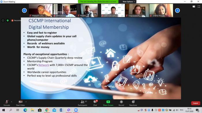 Спікерами вебінару виступили Rick D. Blasgen – президент та генеральний директор CSCMP, Mark S. Baxa – голова правління CSCMP, Miquel Serracanta – міжнародний радник CSCMP та віце-президент з Програм, Іспанія RT, David Maddox – президент Атланта RT, CSCMP. Обговорювалися питання щодо глобальної стратегії закупівель (Global Sourcing Strategy), змін та висновків в управлінні ланцюгами постачання під час глобальної кризи Covid-19 (Supply Chain Learnings from Covid-19 globalcrisis), еластичності ланцюга постачання, важливості діджиталізації (Supply Chain Resiliency, Importance of Digitalization).