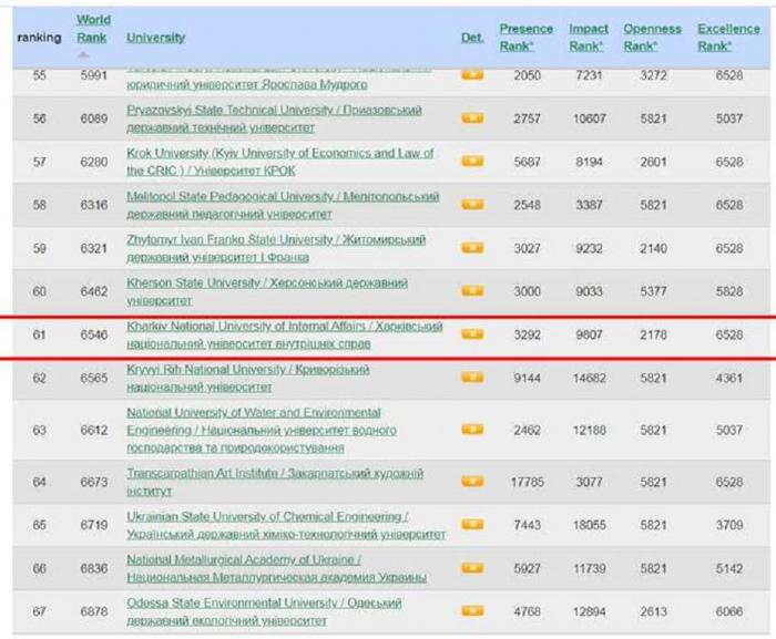 В цілому, ЗВО із специфічними умовами навчання, які входять до системи МВС України, за даними рейтингу Ranking Web of Universities (Webometrics), посіли такі місця: