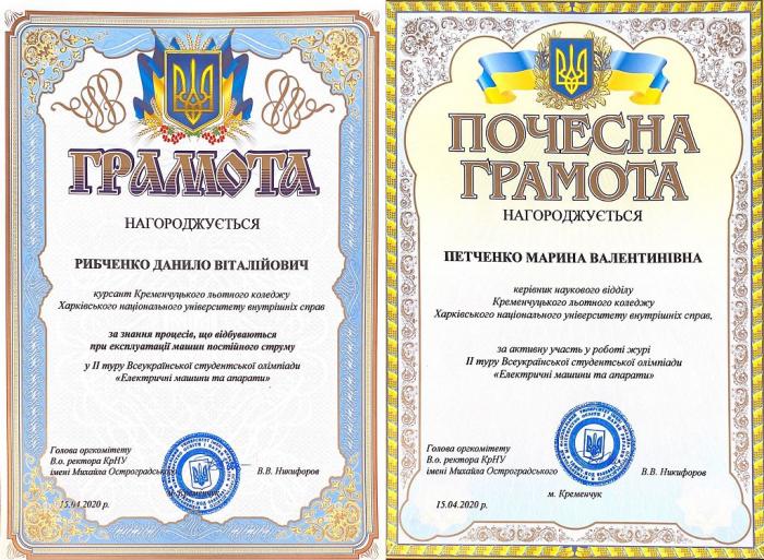 Призером ІІ туру Всеукраїнської студентської олімпіади «Електричні машини та апарати» став курсант Кременчуцького льотного коледжу ХНУВС Данило Рибченко. Він отримав грамоту за знання процесів, що відбуваються при експлуатації машин постійного струму.