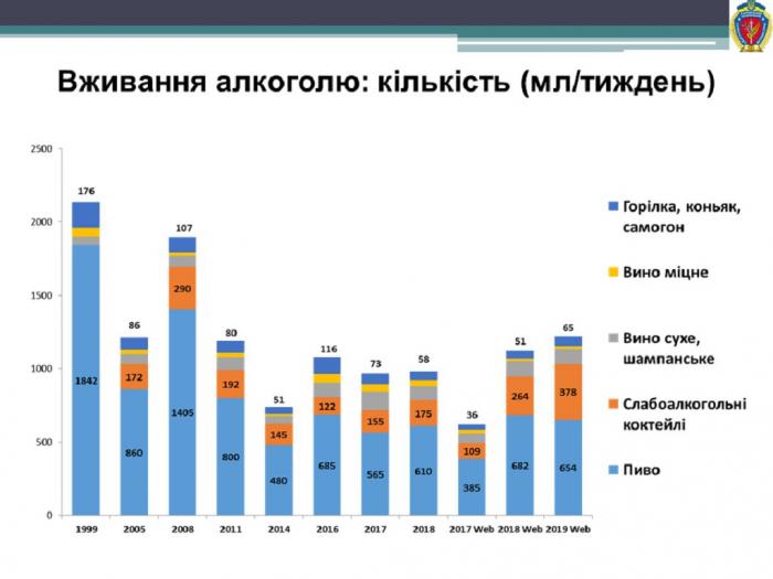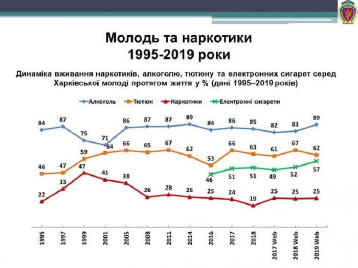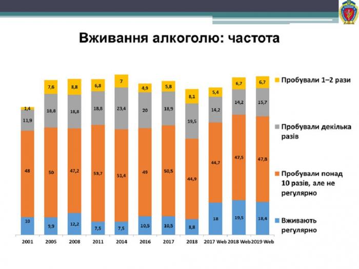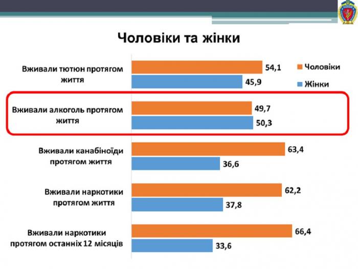 Результати дослідження показують, що алкоголь протягом життя вживало 88,3 % молодих харків'ян, за останні три роки загальна кількість споживачів алкоголю повільно зростає. Відсоток регулярних споживачів залишається відносно стабільним – кожен п’ятий молодий харків’янин вживає алкоголь регулярно (19,0 %). Протягом останніх років відбувається повільне збільшення загальних об’ємів вживання алкоголю молоддю, а у структурі вживання зростають об’єми вживання слабоалкогольних коктейлів та міцних спиртних напоїв (горілки, самогону, коньяку тощо). Алкоголь протягом життя вживали 90,8 % жінок та 86,5 % чоловіків, їх співвідношення становить приблизно 50 до 50, але жінки переважають (50,3 % на 49,7 %). Алкоголь є єдиною речовиною, серед споживачів якої переважають жінки.