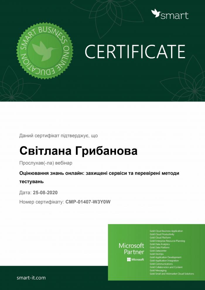 Під час вебінару учасниця ознайомилася з методами безпечної та якісної реалізації процесу екзаменування здобувачів освіти онлайн, методами використання сервісів Microsoft для здавання контрольних робіт, підготовки до заліків та зрізів знань, проведення онлайн-тестування та відслідковування динаміки успішності всієї навчальної групи або кожного здобувача світи окремо.