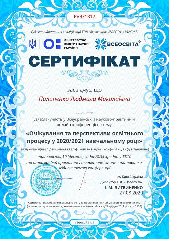 Викладач-методист циклової комісії природничих дисциплін Людмила Пилипенко взяла участь у Всеукраїнській науково-практичній онлайн-конференції «Очікування та перспективи освітнього процесу у 2020–2021 навчальному році».