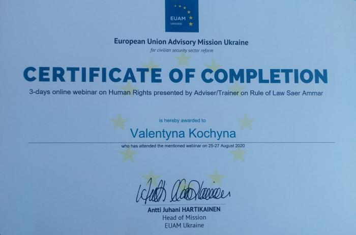 Викладач кафедри іноземних мов Валентина Кочина взяла участь у триденному онлайн-вебінарі «Права людини», де виступав експерт з верховенства права Консультативної місії ЄС в Україні Саер Аммар.