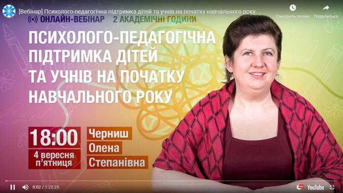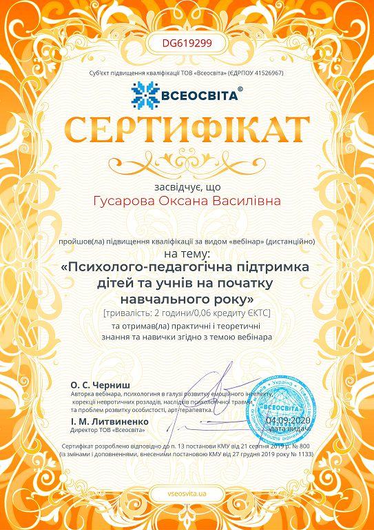 Викладачка циклової комісії природничих дисциплін Оксана Гусарова взяла участь у вебінарі «Психолого-педагогічна підтримка дітей та учнів на початку навчального року». Під час вебінару спікер познайомила учасників з особливостями психолого-педагогічних проблем у здобувачів освіти, які можуть проявитися на початку навчального року, і запропонувала можливі шляхи їх вирішення. Отриманні знання викладачка буде застосовувати у виховній та навчальній роботі.