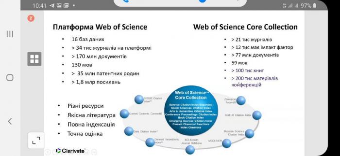 Під час вебінару викладач прослухала інформацію щодо розрахунку показників: h-index, impact factor та індексу оперативності. На практичних прикладах спікер пояснив, як порахувати кількість статей групи науковців або установи за певний проміжок часу, що проіндексовані у Web of Science Core Collection, як знайти для заданої теми найцитованіші роботи, як перевірити індексацію, які формати видань є та як не витрачати багато часу на оформлення публікації.