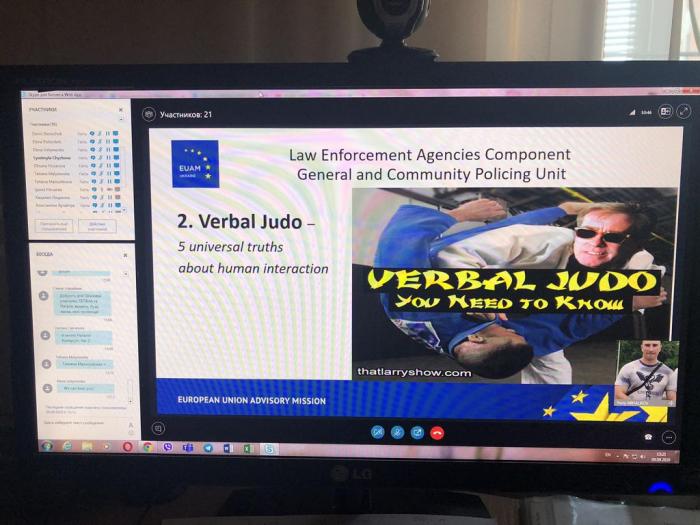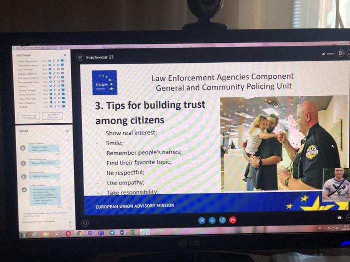 Спікером заходу виступив радник/тренер з питань взаємодії поліції з громадою Юрій Міхалков (Регіональне представництво КМЄС у Харкові). Він поділився досвідом Болгарії та прикладами з власного життя, наддав поради як досягти довіри та побудувати ефективні відносини між поліцією та громадянами, відповів на запитання учасників вебінару.