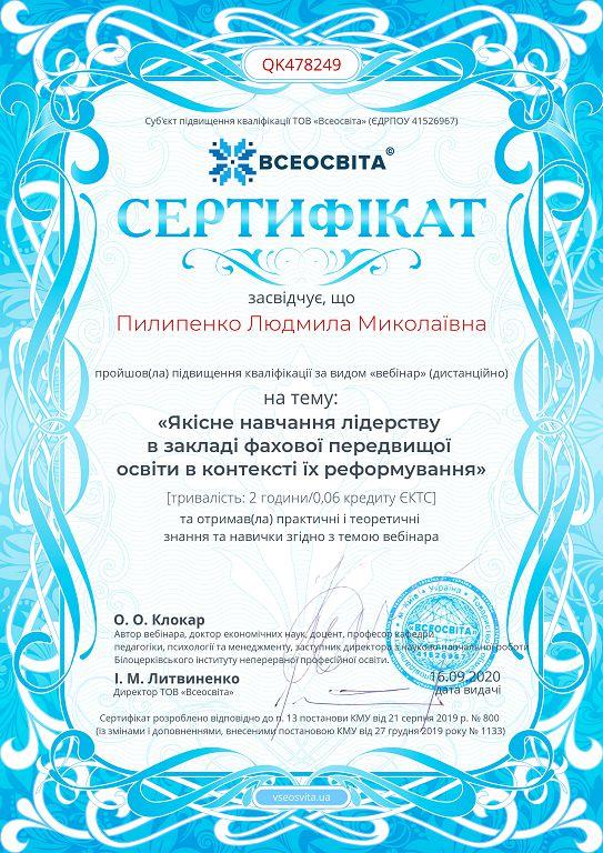 Викладач циклової комісії природничих дисциплін Кременчуцького льотного коледжу Харківського національного університету внутрішніх справ Людмила Пилипенко дистанційно взяла участь у вебінарі на тему «Якісне навчання лідерству в закладі фахової передвищої освіти в контексті їх реформування».