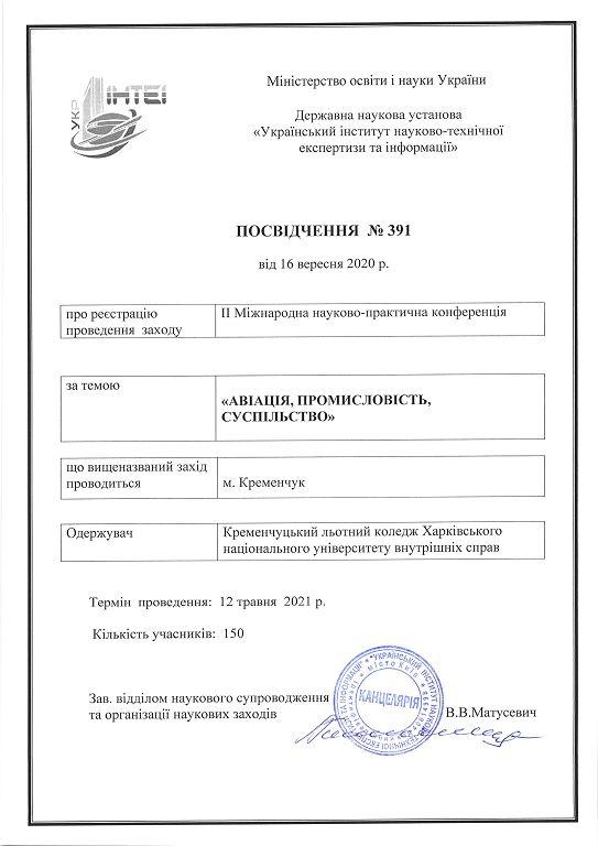 Науковим відділом Кременчуцького льотного коледжу Харківського національного університету внутрішніх справ були підготовлені документи для реєстрації наукового заходу в Державній науковій установі «Український інститут науково-технічної експертизи та інформації». 16 вересня 2020 року від УкрІНТЕІ отримано Посвідчення № 391 про зареєстровану ІІ Міжнародну науково-практичну конференцію «Авіація, промисловість, суспільство» з внесенням в інформаційний бюлетень «План проведення наукових, науково-технічних заходів в Україні». Науковий захід планується провести 12 травня 2021 року на базі коледжу.