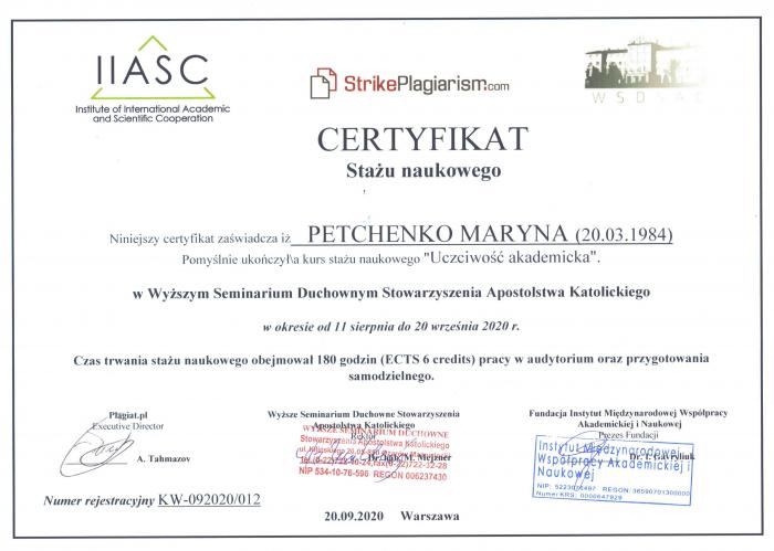 Начальник наукового відділу Кременчуцького льотного коледжу Харківського національного університету внутрішніх справ кандидат економічних наук Марина Петченко пройшла наукове онлайн-стажування на тему «Академічна доброчесність», яке було організовано Польсько-українською фундацією «Інститут Міжнародної Академічної і Наукової Співпраці» на базі Вищого Семінаріуму Духовного університету UKSW у м. Варшава, Польща.