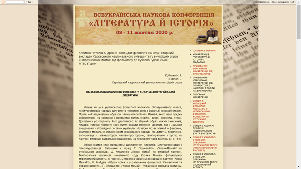 Наталія Кобилко представила до розгляду доповідь «Образ Козака Мамая: від фольклору до сучасної української літератури». Авторка дослідила образ народного героя в химерному романі Олександра Ільченка «Козацькому роду нема переводу, або Козак Мамай і Чужа Молодиця» та в «антидетективі» Братів Капранових «Справа Сивого» й дійшла висновку, що запорожець Мамай в українській свідомості є символом мужності, звитяги, вірності рідній землі та готовності її захищати, навіть ціною власного життя.