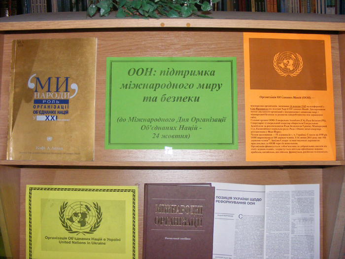 Книжково-ілюстративна експозиція розкриває історію створення, структуру, мету та завдання Організації Об’єднаних Націй. Бібліотека запрошує всіх бажаючих ознайомитися з книжково-ілюстративною експозицією.