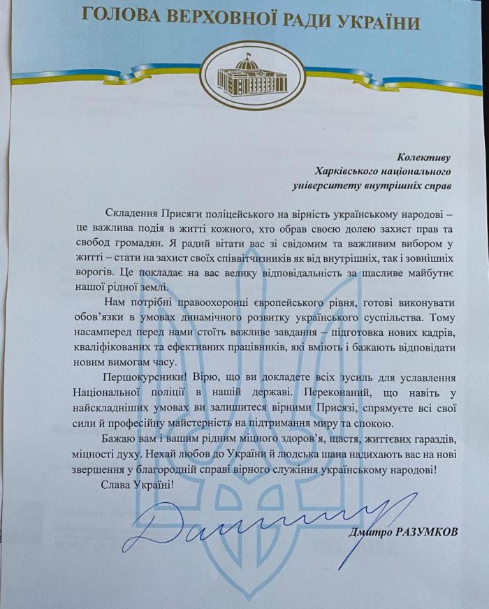 Першокурсники! Вірю, що ви докладе всіх зусиль для уславлення Національної поліції в нашій державі. Переконаний, що навіть у найскладніших умовах ви залишитеся вірними Присязі, спрямуєте всі свої сили і професійну майстерність на підтримання миру та спокою.
