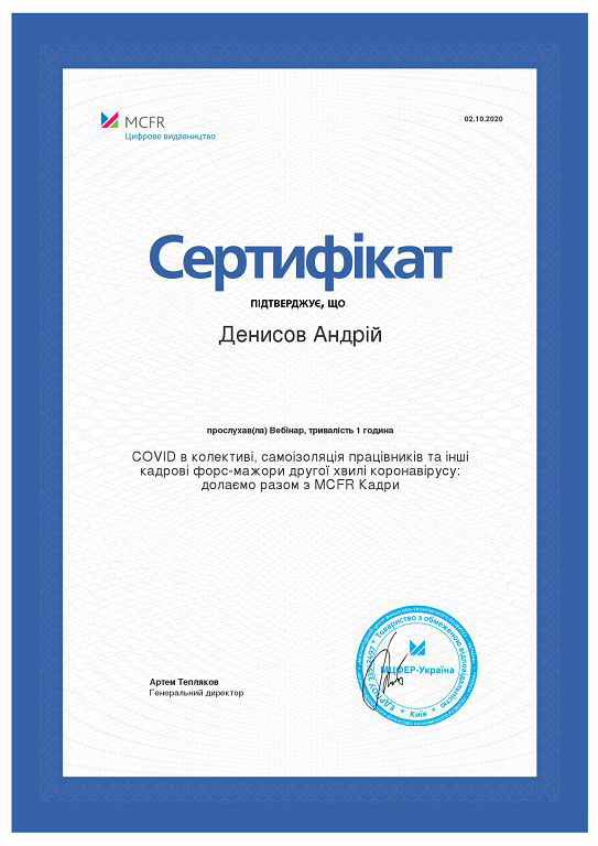 Проректор університету професор кафедри правового забезпечення господарської діяльності факультету № 6 Леонід Могілевський та доценти кафедри Ірина Василько, Артем Подорожній, Андрій Денисов, Євгенія Ананьєва, Вікторія Сичова та Тетяна Пузанова відвідали вебінар за темою «COVID в колективі, самоізоляція працівників та інші кадрові форс-мажори другої хвилі коронавірусу: долаємо разом з MCFR Кадри», організований Цифровим видавництвом MCFRта отримали відповідний сертифікат.