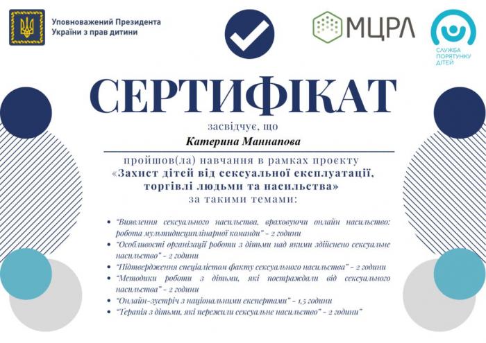 Доцентка кафедри соціології та психології факультету № 6, психолог-спеціаліст Зеленої кімнати Харківського національного університету внутрішніх справ Катерина Маннапова пройшла навчання за курсом «Захист дітей від сексуальної експлуатації, торгівлі та насильства», який проводили Громадська організація «Служба порятунку дітей» спільно з МГО «Міжнародний центр розвитку та лідерства» з метою забезпечення дотримання прав та інтересів дитини та її захисту від сексуальної експлуатації, торгівлі та насильства. Навчання проводили як міжнародні, так і вітчизняні провідні спеціалісти.