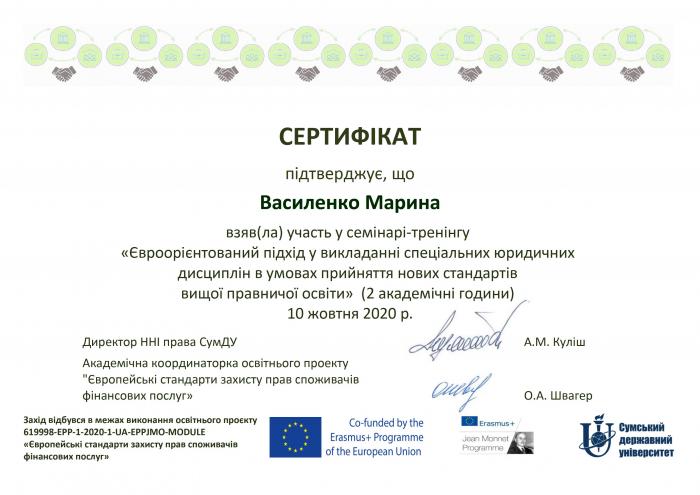 Доцент кафедри юридичних дисциплін Сумської філії Харківського національного університету внутрішніх справ Марина Василенко стала учасником семінару-тренінгу «Євроорієнтований підхід у викладанні спеціальних юридичних дисциплін в умовах прийняття нових стандартів вищої правничої освіти», який відбувся у рамках проєкту напряму модуль Жана Моне «Європейські стандарти захисту прав споживачів фінансових послуг».