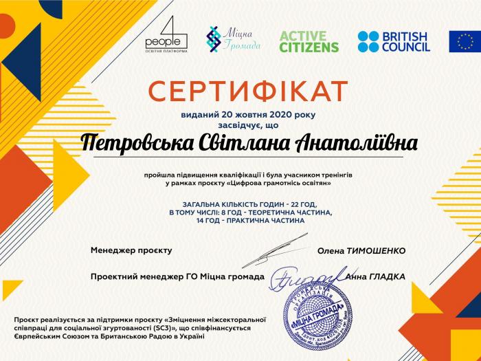 Після завершення програми викладач отримала сертифікат про підвищення кваліфікації.
