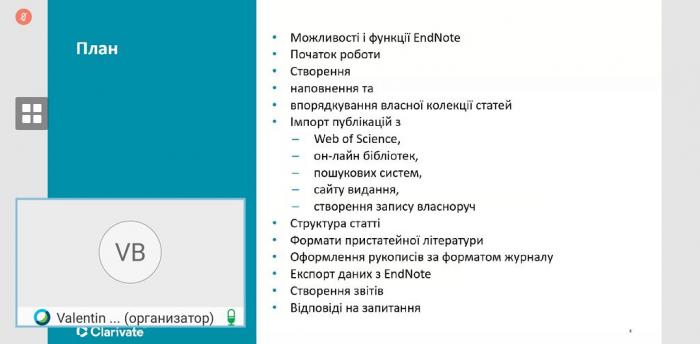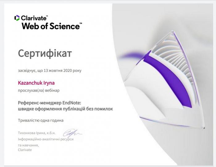 Під час вебінарів Ірина Казанчук ознайомилася з інформацією, яка стосувалася основ наукометрії; можливостей референс-менеджера End Note для швидкого і точного оформлення публікацій; створення, наповнення та використання основних авторських профілів Publons та Orcid та як і чим можуть допомогти Web of Science та In Cites при подачі грантової заявки; імпорту публікацій з Web of Science, он-лайн бібліотек, пошукових систем, оформлення рукописів та пристатейної літератури за форматом журналу, експорт даних з End Note. Також було розглянуто питання щодо грантової підтримки у Web of Science Core Collection, пошуку й аналізу літератури, видань, ефективності співпраці за допомогою аналітичної системи In Cites, процедури та особливостей оцінювання грантових заявок і на що варто звернути увагу при написанні проєкту. Отримана інформація і презентаційний матеріал є корисними в процесі здійснення науково-дослідницької діяльності.
