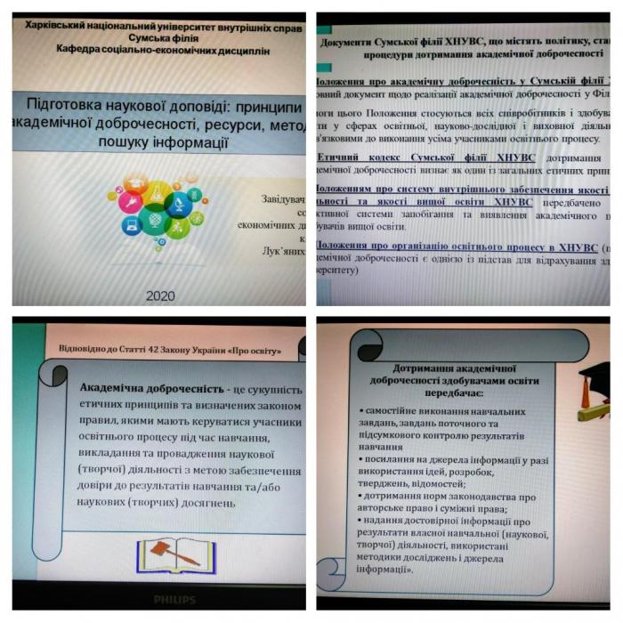 Доповідач зупинилася на основних видах порушень академічної доброчесності та видах відповідальності здобувачів вищої освіти за її порушення. Присутніх було ознайомлено з основними документами Сумської філії ХНУВС, що містять політику, стандарти і процедури дотримання академічної доброчесності.