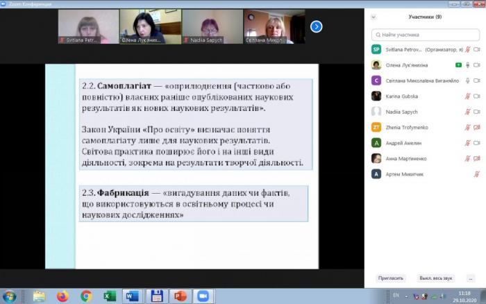 Завідувач кафедри соціально-економічних дисциплін кандидат економічних наук, доцент Олена Лук’янихіна провела бесіду на тему «Підготовка наукової доповіді: принципи академічної доброчесності, ресурси, методи пошуку інформації». Олена Анатоліївна ознайомила присутніх із сутністю академічної доброчесності в цілому, що саме передбачає дотримання її принципів педагогічними, науково-педагогічними та науковими працівниками та здобувачами вищої освіти.