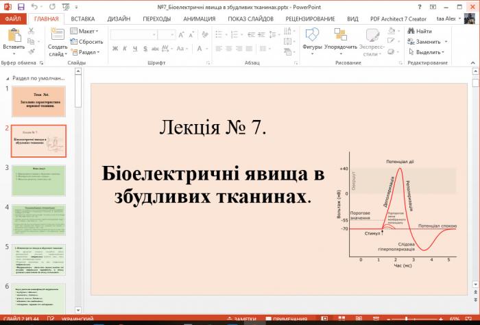 Доцентка кафедри, кандидатка біологічних наук Олена Шахова розповіла студентам про біоелектричні явища в нервовій тканині, які є фізіологічною основою психічних процесів, а також про фактори, які обумовлюють виникнення та існування потенціалу спокою в мембранах нейронів.
