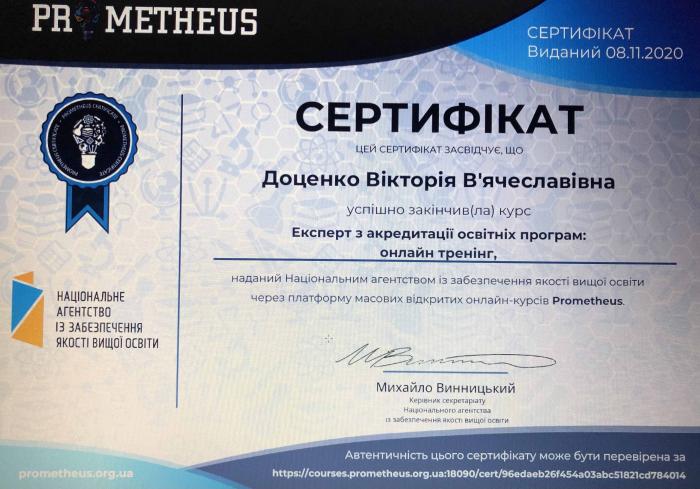 Вікторія Доценко пройшла онлайн-тренінг, здобула необхідні теоретичні знання, ознайомилася з процедурою акредитації та критеріями оцінювання освітніх програм, роллю експерта з оцінювання освітніх програм в акредитаційному процесі. Доцентка успішно пройшла підсумкове тестування та отримала відповідний сертифікат.