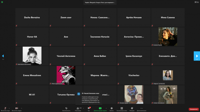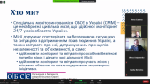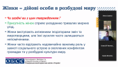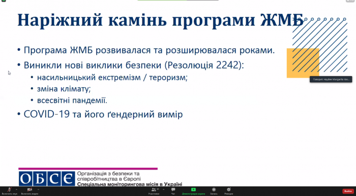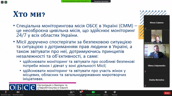 Хайді Маргарита Васкес Панес, спостерігач та координатор з гендерних питань Спеціальної моніторингової місії ОБСЄ в Україні, розповіла про зміст Резолюції РБ ООН 1325, спостереження та дослідження ОБСЄ щодо добробуту та безпеки жінок в Україні, підкреслила важливість ролі жінок у подоланні конфліктів та розбудові миру, окреслила вплив пандемії COVID- 19 на випадки домашнього насилля, а також поділилася власним досвідом та досвідом інших лідерок громад і спостерігачок СММ ОБСЄ під час їх роботи в місцях охоплених конфліктом.
