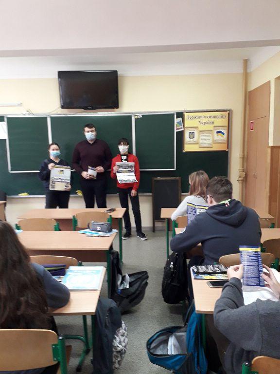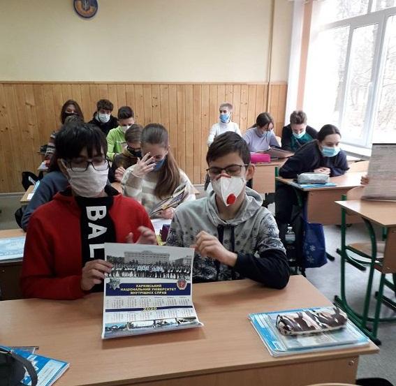 Викладач кафедри іноземних мов розповів учням випускних класів про особливості підготовки поліцейських, умови вступу і навчання, побуту та дозвілля курсантів та студентів. Юнаки та дівчата дізналися про сайт ХНУВС, де можна ознайомиться з новинами повсякденного життя університету, та отримали довідкові матеріали.