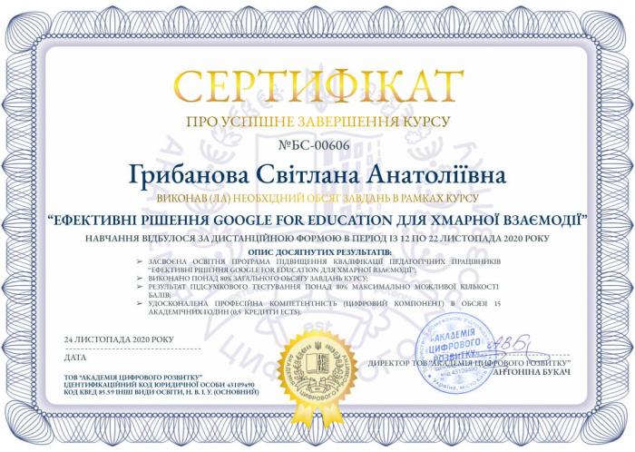 Викладачка циклової комісії природничих дисциплін Кременчуцького льотного коледжу ХНУВС Світлана Грибанова закінчила навчання та успішно склала підсумковий тест навчального курсу «Ефективні рішення Google for Education для хмарної взаємодії», організований Міністерством освіти і науки України та компанією Google Україна.