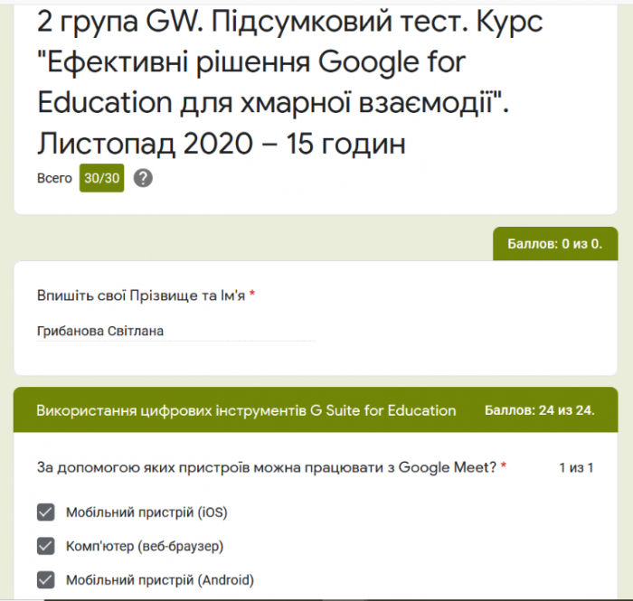 Під час навчання учасники курсу опрацювали можливості додатків Google Workspace (G Suite) при роботі з вебінтерфейсом персональних комп’ютерів та використання додатків Google Workspace (G Suite) на мобільних пристроях.